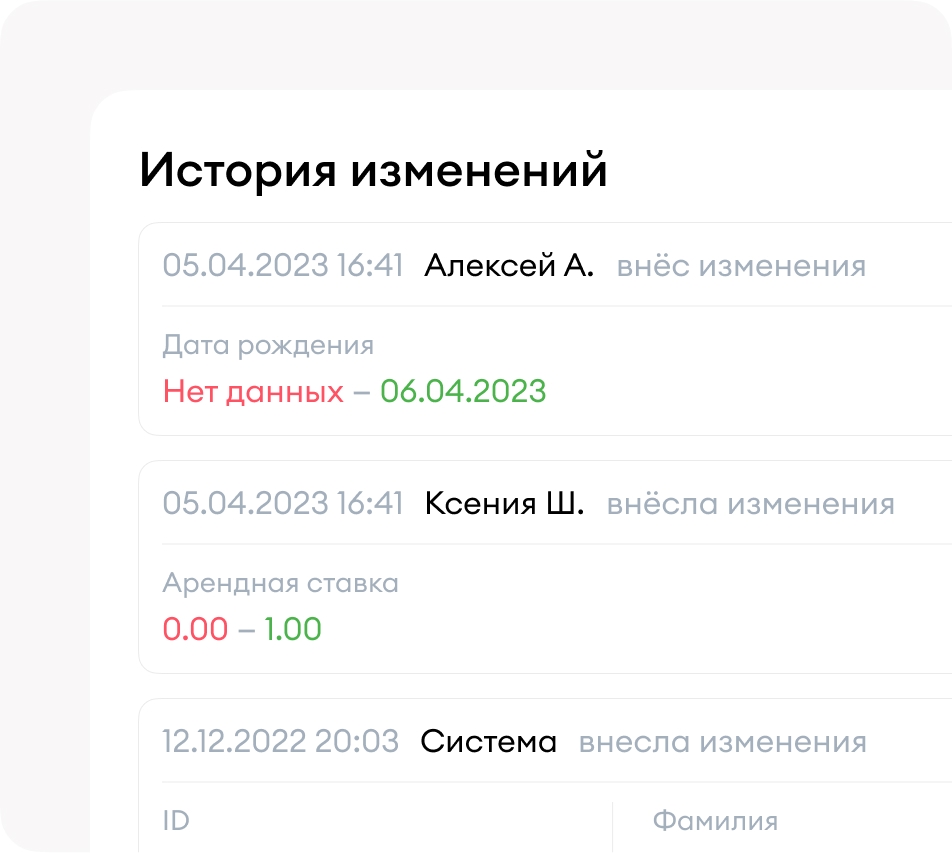 Действия в системе фиксируются — следите за качеством работы и эффективностью сотрудников. Вскоре мы добавим ещё больше возможностей для контроля